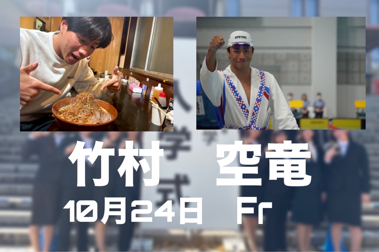 🌙 メンバーブログ 2025.04.23 こんばんは! 本日の自己紹介は… 1.竹村空竜 2.埼玉県 3.10月24日 4.自由形 5.心絵/ロードオブメジャー 6.プルパドはなかなか強いです 7.キック鍛えます 期待の新入生、空竜です! 1年目からの活躍に期待です⚡️