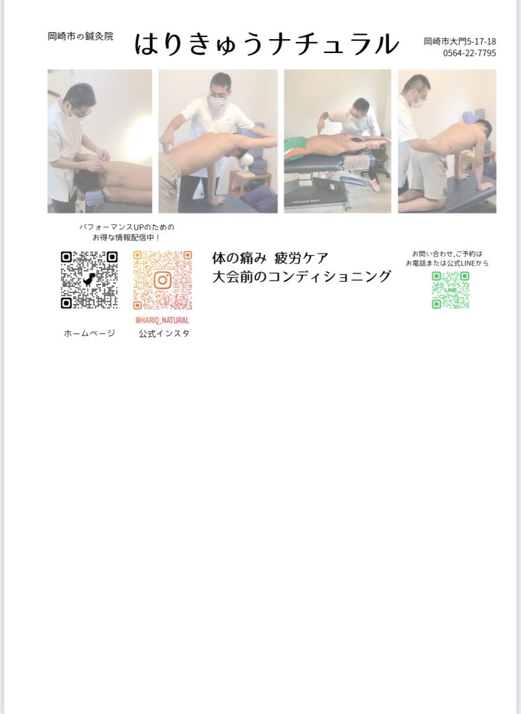 はり・きゅう・カイロプラクティック・スポーツ鍼灸など様々なアプローチで患者さんの悩みを改善してくれます!アスリートの体の痛み、疲労ケア、コンディショニングは是非「はりきゅうナチュラル」へ!