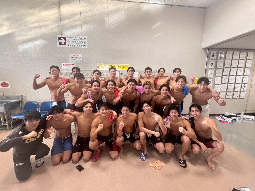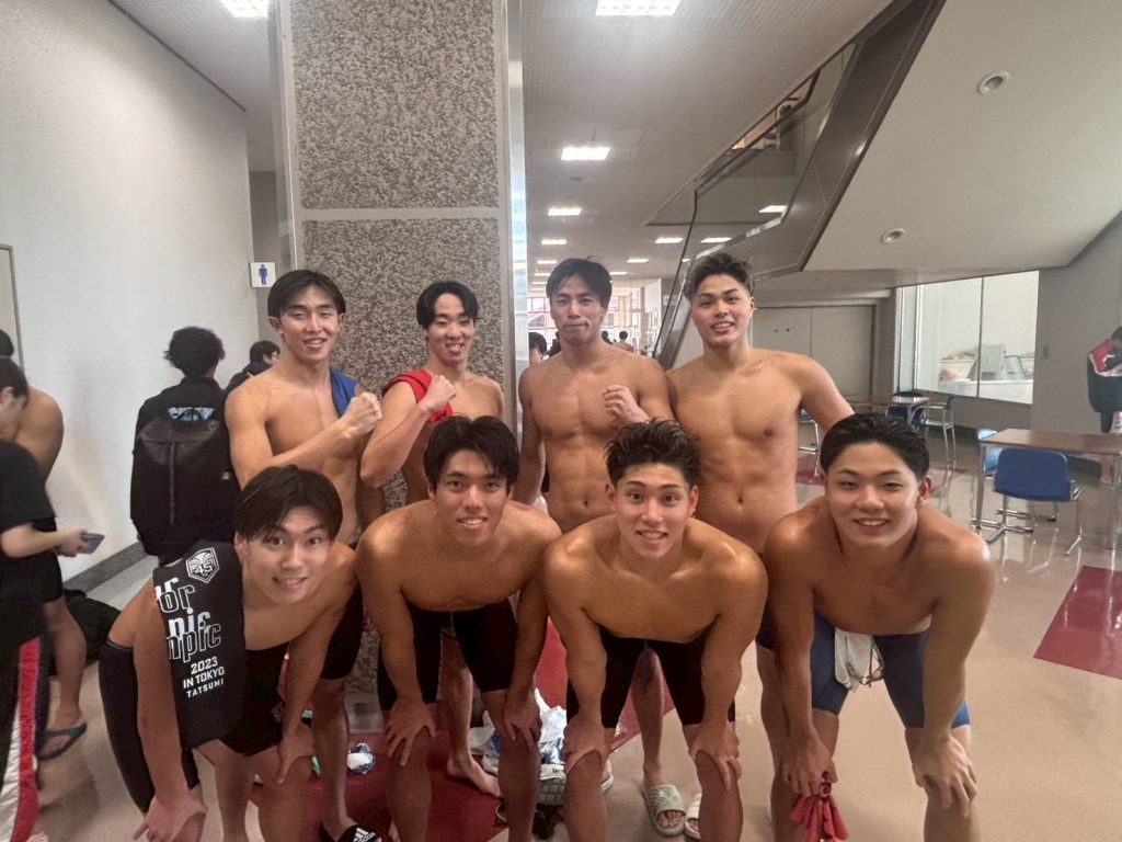 800mフリーリレーの全体での写真です。優勝準優勝は3年生チームでした。やはり最高学年の意地が感じられる泳ぎをしていました👍